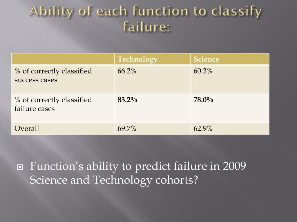 Ability of each function to classify failure: • Function’s ability to predict failure in 2009 Science and Technology cohorts?