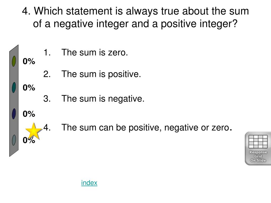 4. Which statement is always true about the sum of a negative integer and a positive integer? • The sum is zero. • The sum is positive. • The sum is negative. • The sum can be positive, negative or zero. index