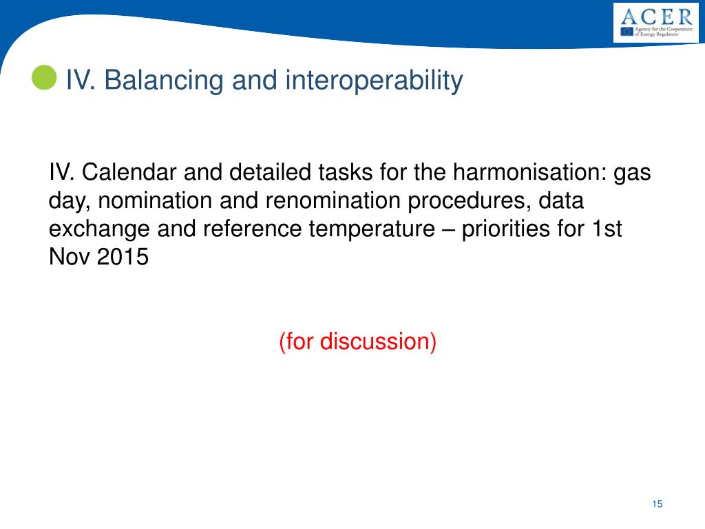 IV. Balancing and interoperability • IV. Calendar and detailed tasks for the harmonisation: gas day, nomination and renomination procedures, data exchange and reference temperature – priorities for 1st Nov 2015 • (for discussion)