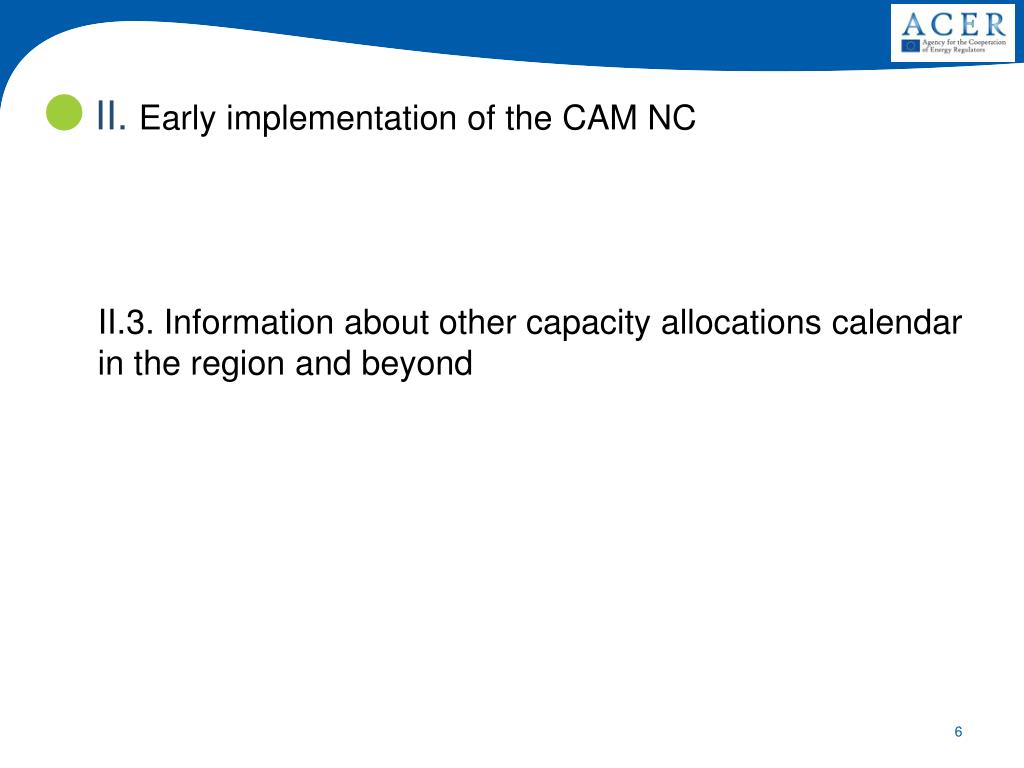 II. Early implementation of the CAM NC • II.1. Supervision of the yearly capacity auction in March 2014 • CAM NC establishes that NRAs should ensure that CAMs are implemented at the IPs in the most effective way • SPAIN • Following the Circular 1/2014 de la CNMC, the Spanish regulator is going to supervise the application of CAM in last 3rd March auction. • For this purpose, CNMC has requested information to ENAGÁS. The deadline to receive the information on the process is 28 April.