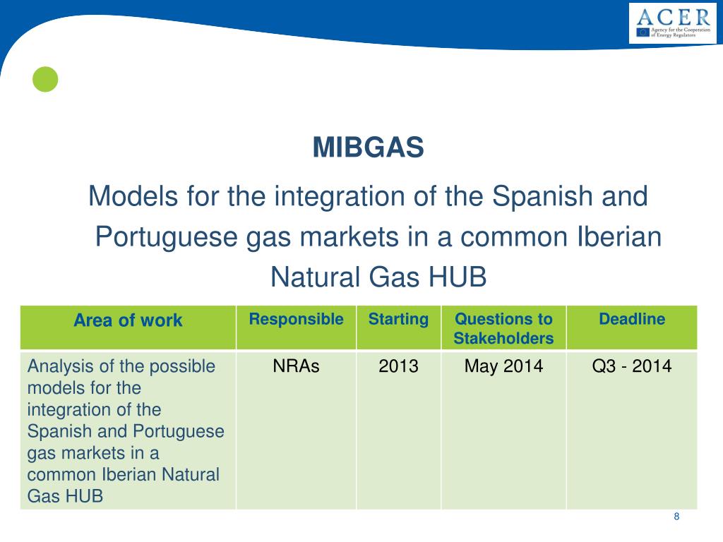 IBERIAN GAS HUB Work in progress • Document analyzing the advantages and drawbacks of the possible models, the regulatory harmonization requisites for its implementation by CNMC – ERSE (2014 April) . • Public hearing (2014 May) • Analysis of stakeholders responses to the public hearing (2014-Q3) • Final document to be approved by CNMC- ERSE (2014-Q3)