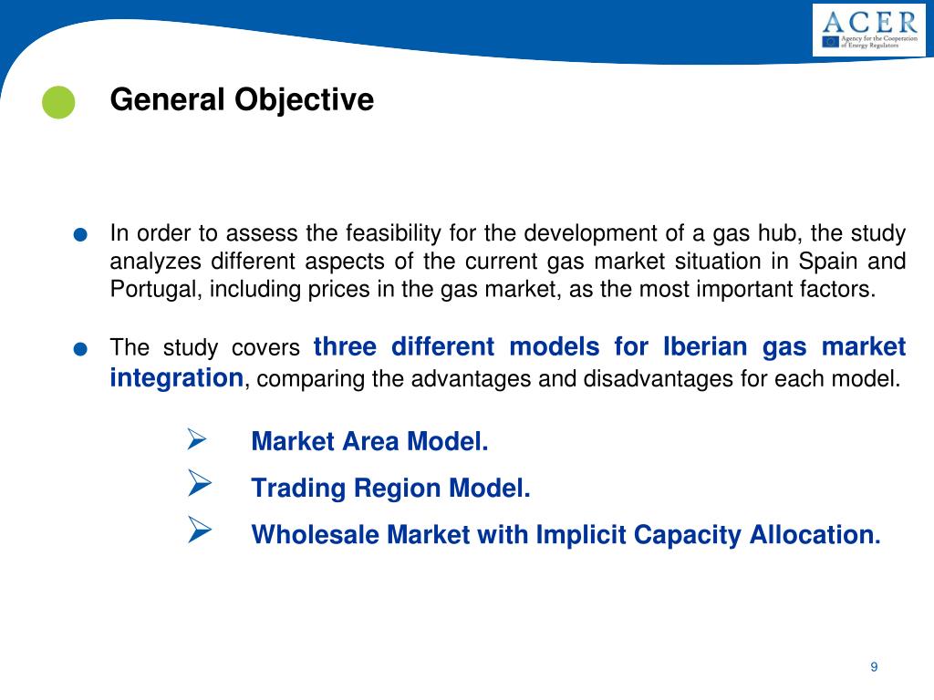 General Objective • In order to assess the feasibility for the development of a gas hub, the study analyzes different aspects of the current gas market situation in Spain and Portugal, including prices in the gas market, as the most important factors. • The study covers three different models for Iberian gas market integration, comparing the advantages and disadvantages for each model. • Market Area Model. • Trading Region Model. • Wholesale Market with Implicit Capacity Allocation.
