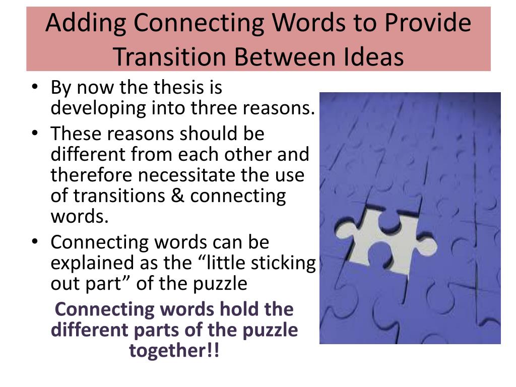 Adding Connecting Words to Provide Transition Between Ideas • By now the thesis is developing into three reasons. • These reasons should be different from each other and therefore necessitate the use of transitions & connecting words. • Connecting words can be explained as the “little sticking out part” of the puzzle Connecting words hold the different parts of the puzzle together!!