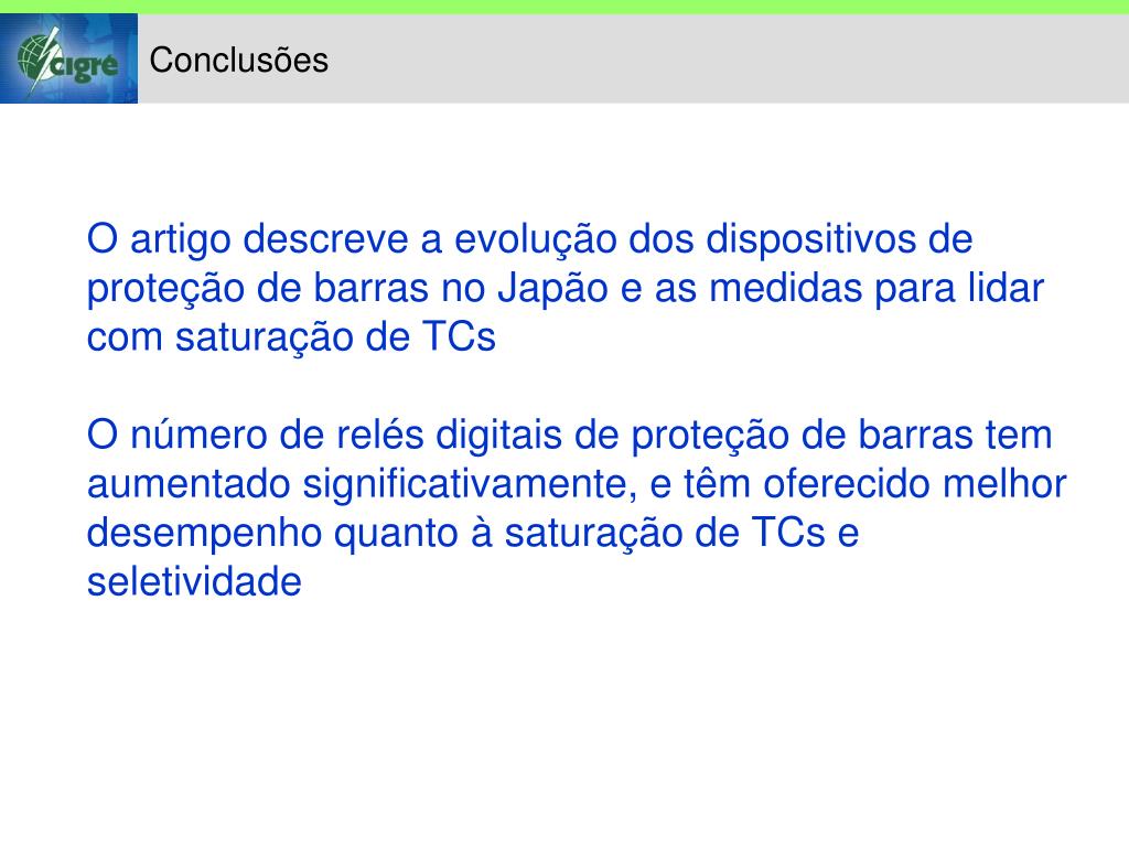 Conclusões O artigo descreve a evolução dos dispositivos de proteção de barras no Japão e as medidas para lidar com saturação de TCs O número de relés digitais de proteção de barras tem aumentado significativamente, e têm oferecido melhor desempenho quanto à saturação de TCs e seletividade