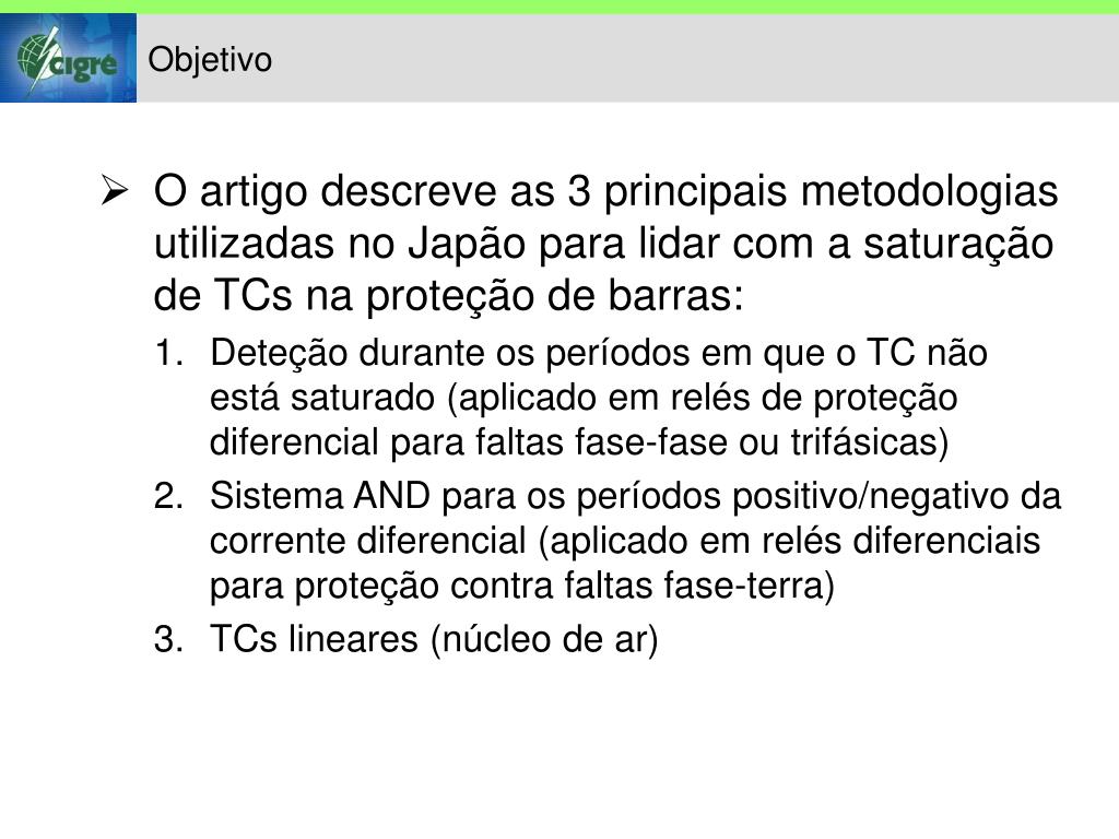 Objetivo • O artigo descreve as 3 principais metodologias utilizadas no Japão para lidar com a saturação de TCs na proteção de barras: • Deteção durante os períodos em que o TC não está saturado (aplicado em relés de proteção diferencial para faltas fase-fase ou trifásicas) • Sistema AND para os períodos positivo/negativo da corrente diferencial (aplicado em relés diferenciais para proteção contra faltas fase-terra) • TCs lineares (núcleo de ar)