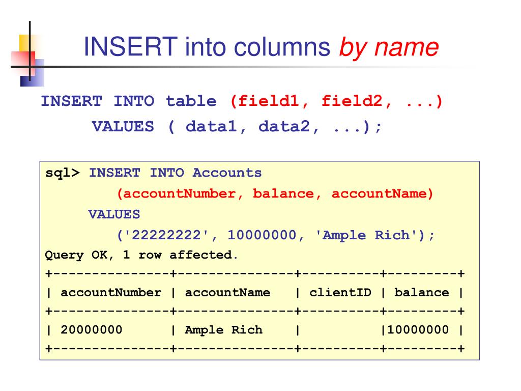 INSERT into columns by name INSERT INTO table (field1, field2, ...) VALUES ( data1, data2, ...); sql> INSERT INTO Accounts (accountNumber, balance, accountName) VALUES ('22222222', 10000000, 'Ample Rich'); Query OK, 1 row affected. +---------------+---------------+----------+---------+ | accountNumber | accountName | clientID | balance | +---------------+---------------+----------+---------+ | 20000000 | Ample Rich | |10000000 | +---------------+---------------+----------+---------+