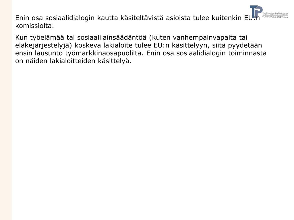 Enin osa sosiaalidialogin kautta käsiteltävistä asioista tulee kuitenkin EU:n komissiolta. Kun työelämää tai sosiaalilainsäädäntöä (kuten vanhempainvapaita tai eläkejärjestelyjä) koskeva lakialoite tulee EU:n käsittelyyn, siitä pyydetään ensin lausunto työmarkkinaosapuolilta. Enin osa sosiaalidialogin toiminnasta on näiden lakialoitteiden käsittelyä.