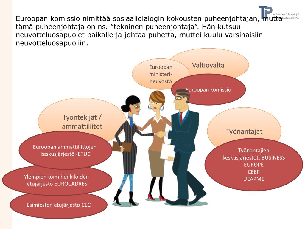 Valtiovallan rooli kuuluisi oikeasti Euroopan ministerineuvostolle. Se ei kuitenkaan ole tässä neuvottelupöydässä mukana, vaan sen kantaa joudutaan kysymään erikseen. Tältä osin Eurooppalaista neuvottelujärjestelmää on vielä varaa kehittää. Valtiovalta Euroopan ministeri-neuvosto Euroopan komissio Työntekijät / ammattiliitot Työnantajat Euroopan ammattiliittojen keskusjärjestö -ETUC Työnantajien keskusjärjestöt: BUSINESS EUROPE CEEP UEAPME Ylempien toimihenkilöiden etujärjestö EUROCADRES Esimiesten etujärjestö CEC