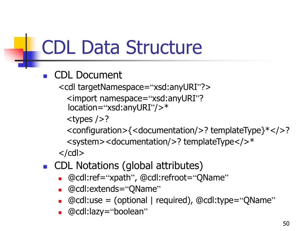 CDL Data Structure • CDL Document <cdl targetNamespace=“xsd:anyURI”?> <import namespace=“xsd:anyURI”? location=“xsd:anyURI”/>* <types />? <configuration>{<documentation/>? templateType}*</>? <system><documentation/>? templateType</>* </cdl> • CDL Notations (global attributes) • @cdl:ref=“xpath”, @cdl:refroot=“QName” • @cdl:extends=“QName” • @cdl:use = (optional | required), @cdl:type=“QName” • @cdl:lazy=“boolean”