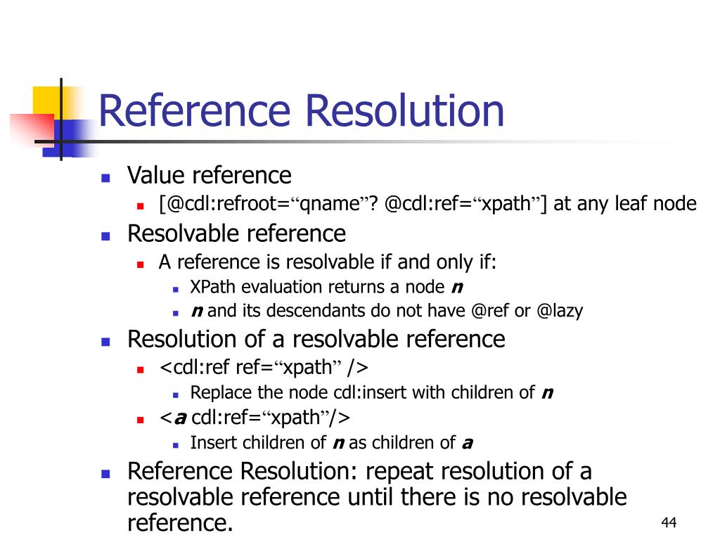 Reference Resolution • Value reference • [@cdl:refroot=“qname”? @cdl:ref=“xpath”] at any leaf node • Resolvable reference • A reference is resolvable if and only if: • XPath evaluation returns a node n • n and its descendants do not have @ref or @lazy • Resolution of a resolvable reference • <cdl:ref ref=“xpath” /> • Replace the node cdl:insert with children of n • <a cdl:ref=“xpath”/> • Insert children of n as children of a • Reference Resolution: repeat resolution of a resolvable reference until there is no resolvable reference.