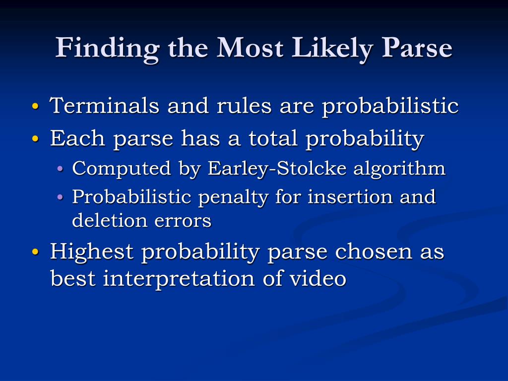 Finding the Most Likely Parse • Terminals and rules are probabilistic • Each parse has a total probability • Computed by Earley-Stolcke algorithm • Probabilistic penalty for insertion and deletion errors • Highest probability parse chosen as best interpretation of video