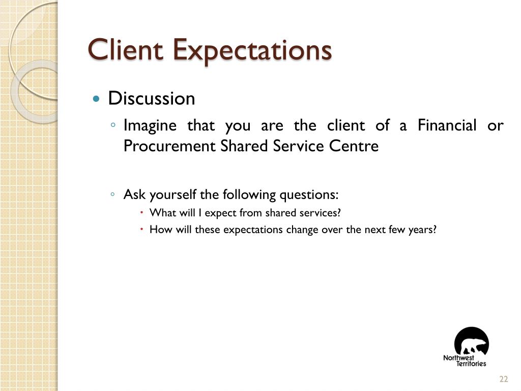 Client Expectations • Discussion • Imagine that you are the client of a Financial or Procurement Shared Service Centre • Ask yourself the following questions: • What will I expect from shared services? • How will these expectations change over the next few years?