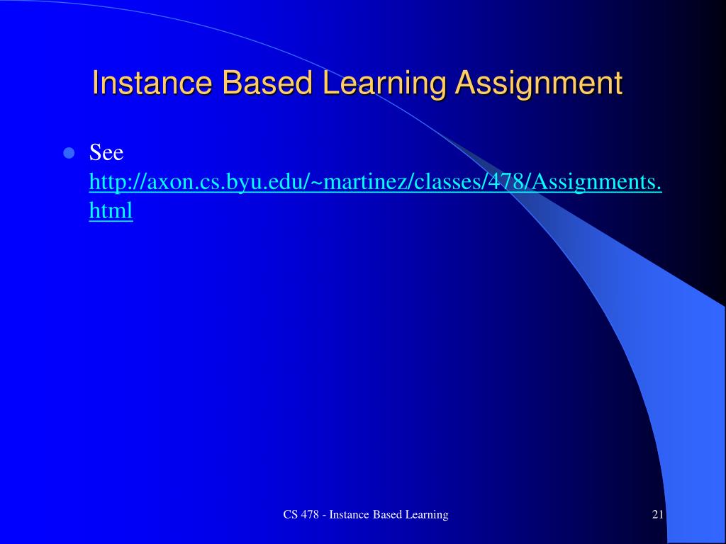 Instance Based Learning Assignment • See http://axon.cs.byu.edu/~martinez/classes/478/Assignments.html CS 478 - Instance Based Learning