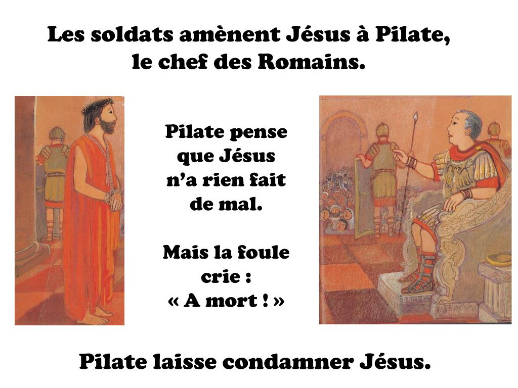 Les soldats amènent Jésus à Pilate, le chef des Romains. Pilate pense que Jésus n’a rien fait de mal. Mais la foule crie : « A mort ! » Pilate laisse condamner Jésus.