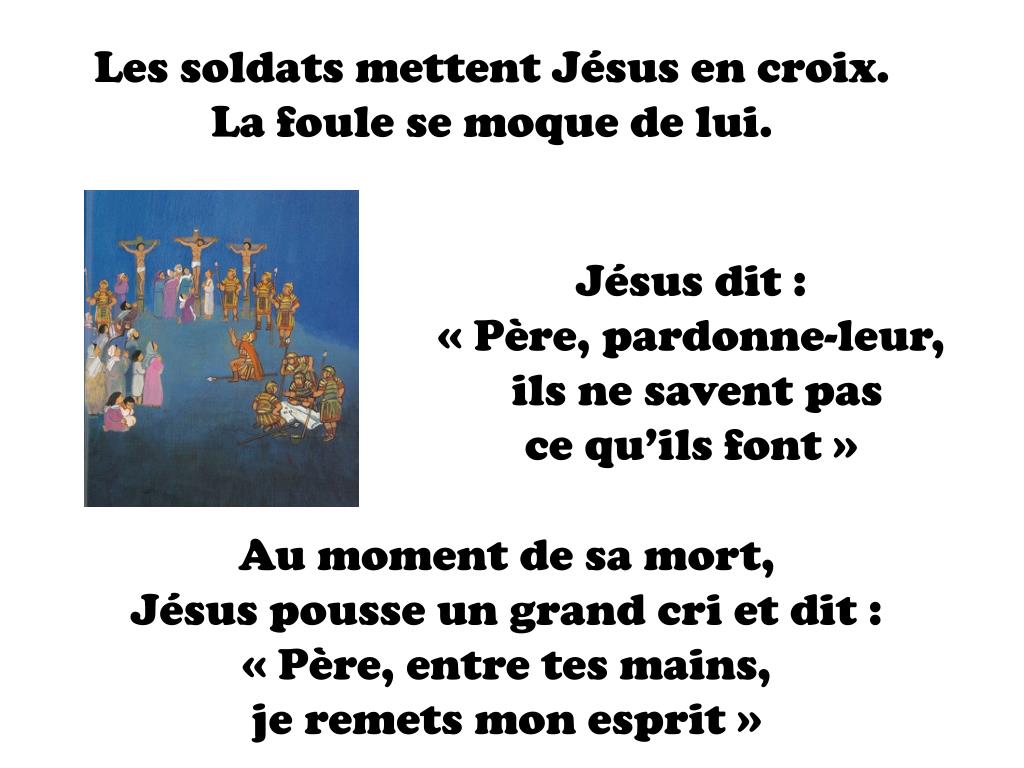 Les soldats mettent Jésus en croix. La foule se moque de lui. Jésus dit : « Père, pardonne-leur, ils ne savent pas ce qu’ils font » Au moment de sa mort, Jésus pousse un grand cri et dit : « Père, entre tes mains, je remets mon esprit »