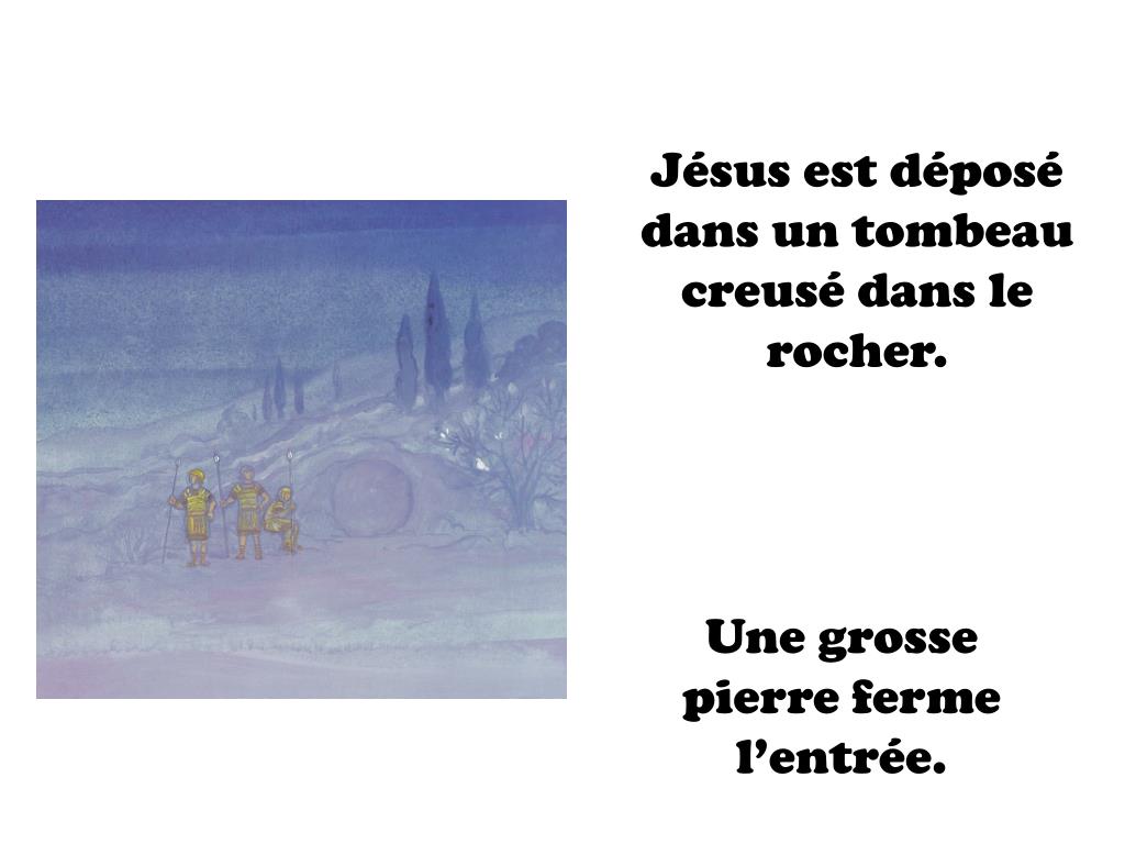 Jésus est déposé dans un tombeau creusé dans le rocher. Une grosse pierre ferme l’entrée.