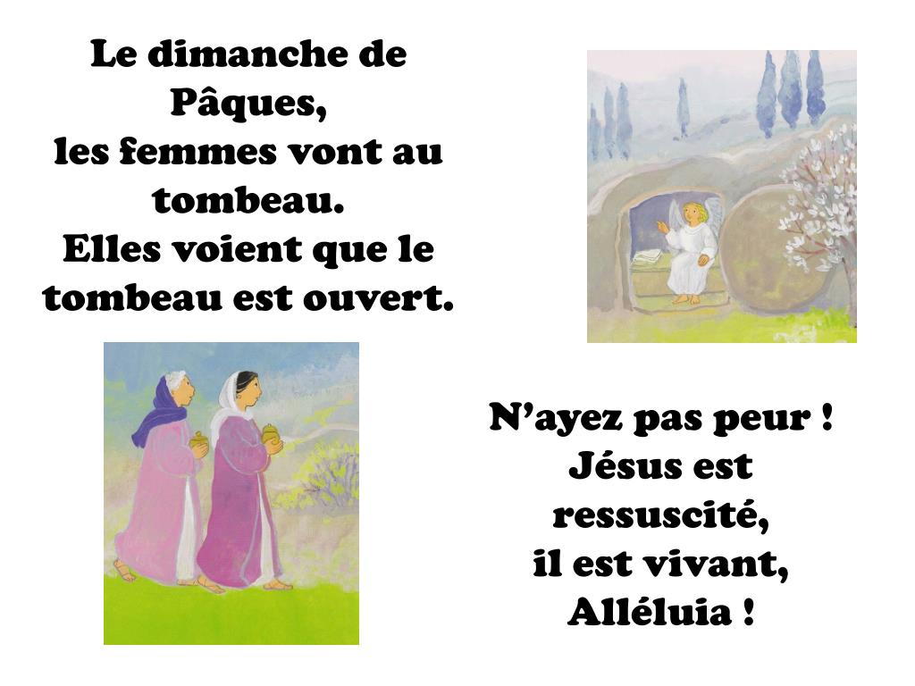 Le dimanche de Pâques, les femmes vont au tombeau. Elles voient que le tombeau est ouvert. N’ayez pas peur ! Jésus est ressuscité, il est vivant, Alléluia !