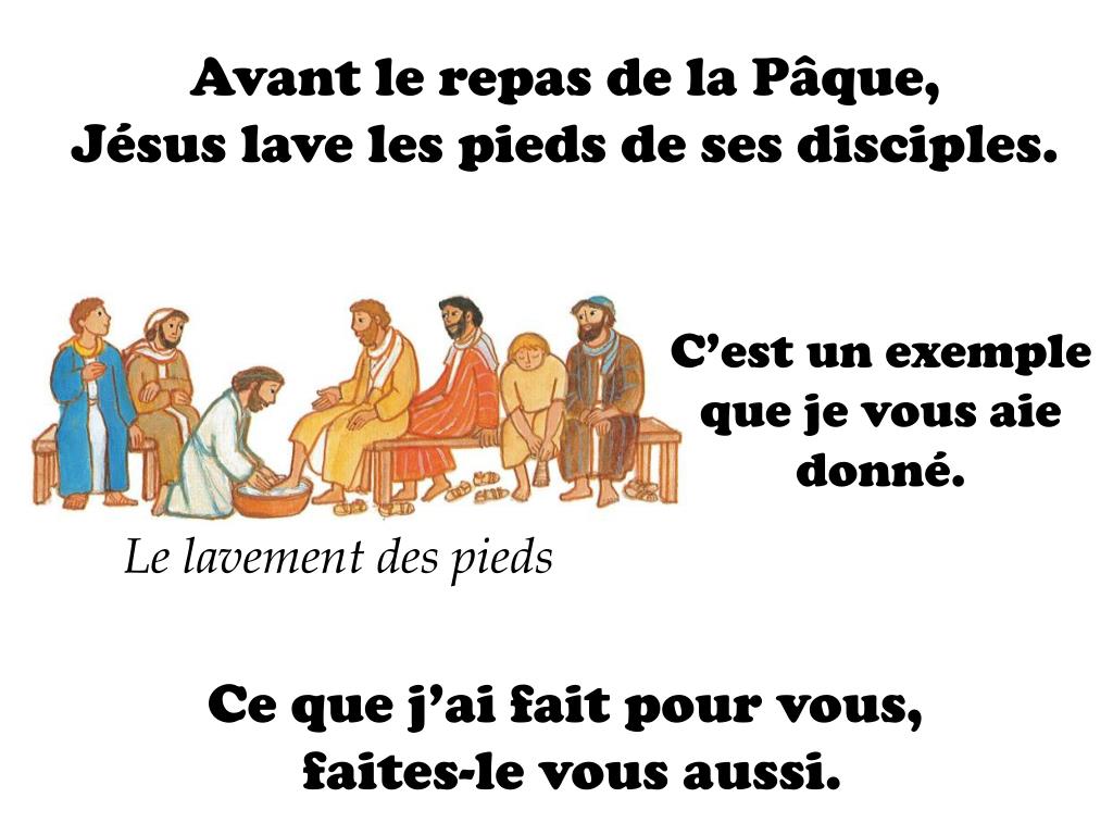 Avant le repas de la Pâque, Jésus lave les pieds de ses disciples. C’est un exemple que je vous aie donné. Le lavement des pieds Ce que j’ai fait pour vous, faites-le vous aussi.
