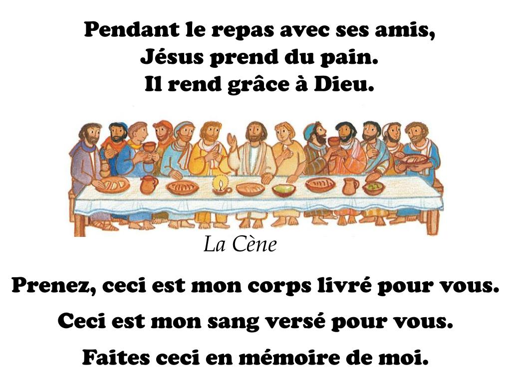 Pendant le repas avec ses amis, Jésus prend du pain. Il rend grâce à Dieu. La Cène Prenez, ceci est mon corps livré pour vous. Ceci est mon sang versé pour vous. Faites ceci en mémoire de moi.