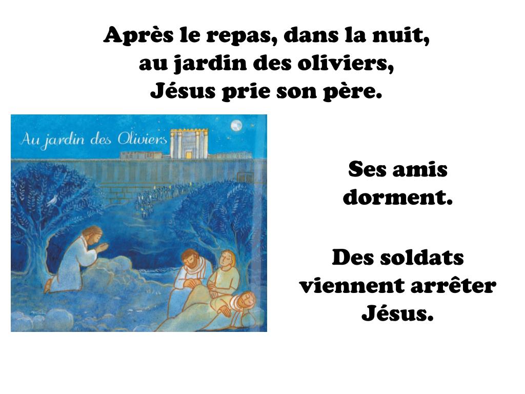 Après le repas, dans la nuit, au jardin des oliviers, Jésus prie son père. Ses amis dorment. Des soldats viennent arrêter Jésus.