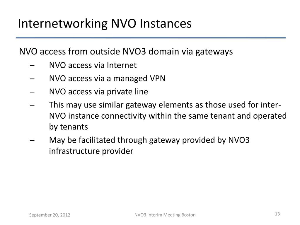 Internetworking NVO Instances • NVO access from outside NVO3 domain via gateways • NVO access via Internet • NVO access via a managed VPN • NVO access via private line • This may use similar gateway elements as those used for inter-NVO instance connectivity within the same tenant and operated by tenants • May be facilitated through gateway provided by NVO3 infrastructure provider NVO3 Interim Meeting Boston