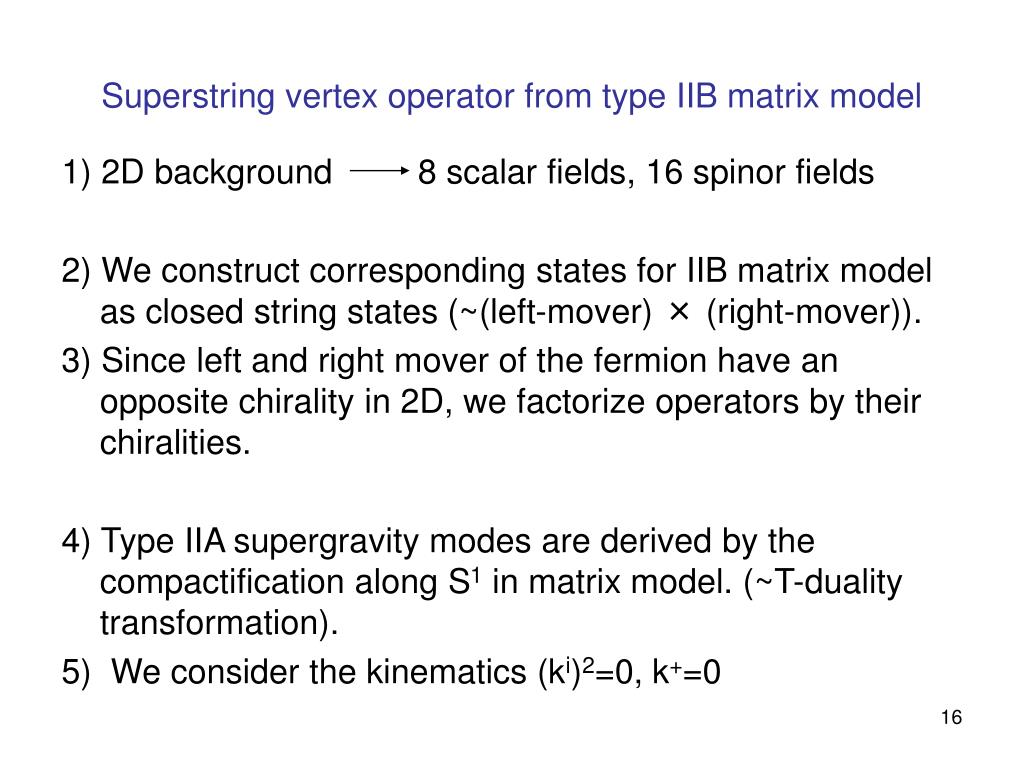 Superstring vertex operator from type IIB matrix model 1) 2D background 8 scalar fields, 16 spinor fields 2) We construct corresponding states for IIB matrix model as closed string states (~(left-mover) × (right-mover)). 3) Since left and right mover of the fermion have an opposite chirality in 2D, we factorize operators by their chiralities. 4) Type IIA supergravity modes are derived by the compactification along S1 in matrix model. (~T-duality transformation). 5) We consider the kinematics (ki)2=0, k+=0