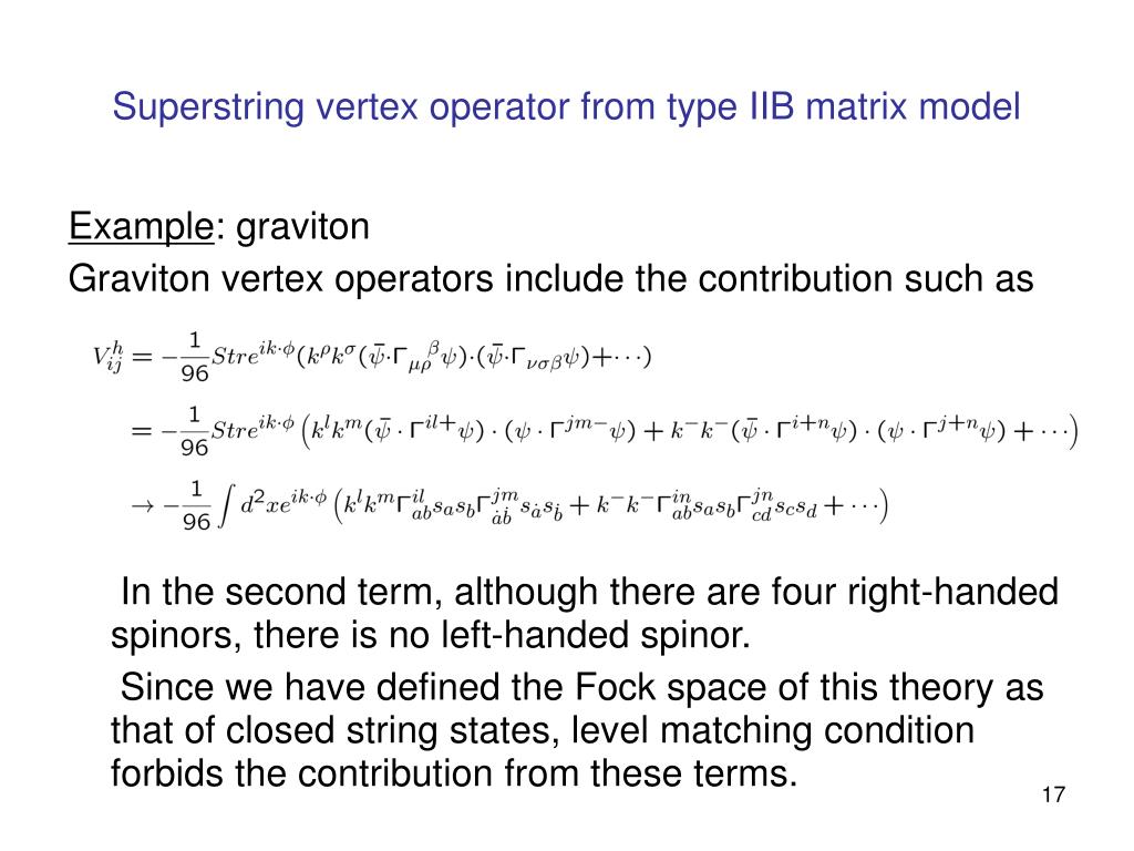 Superstring vertex operator from type IIB matrix model Example: graviton Graviton vertex operators include the contribution such as In the second term, although there are four right-handed spinors, there is no left-handed spinor. Since we have defined the Fock space of this theory as that of closed string states, level matching condition forbids the contribution from these terms.