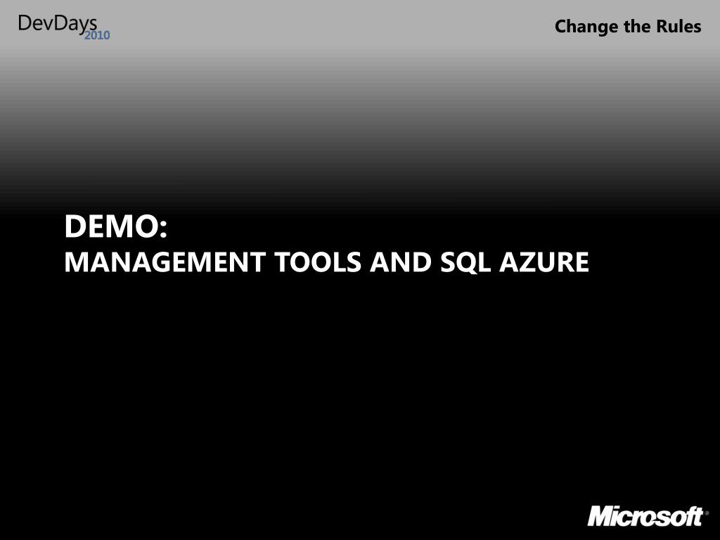 SQL Azure Data Sync • Tools for data synchronization with SQL Azure • Connect on-premises apps with the cloud • Create cached-mode clients • Built on Microsoft Sync Framework and ADO.NET Sync Services SQL Azure Data Sync
