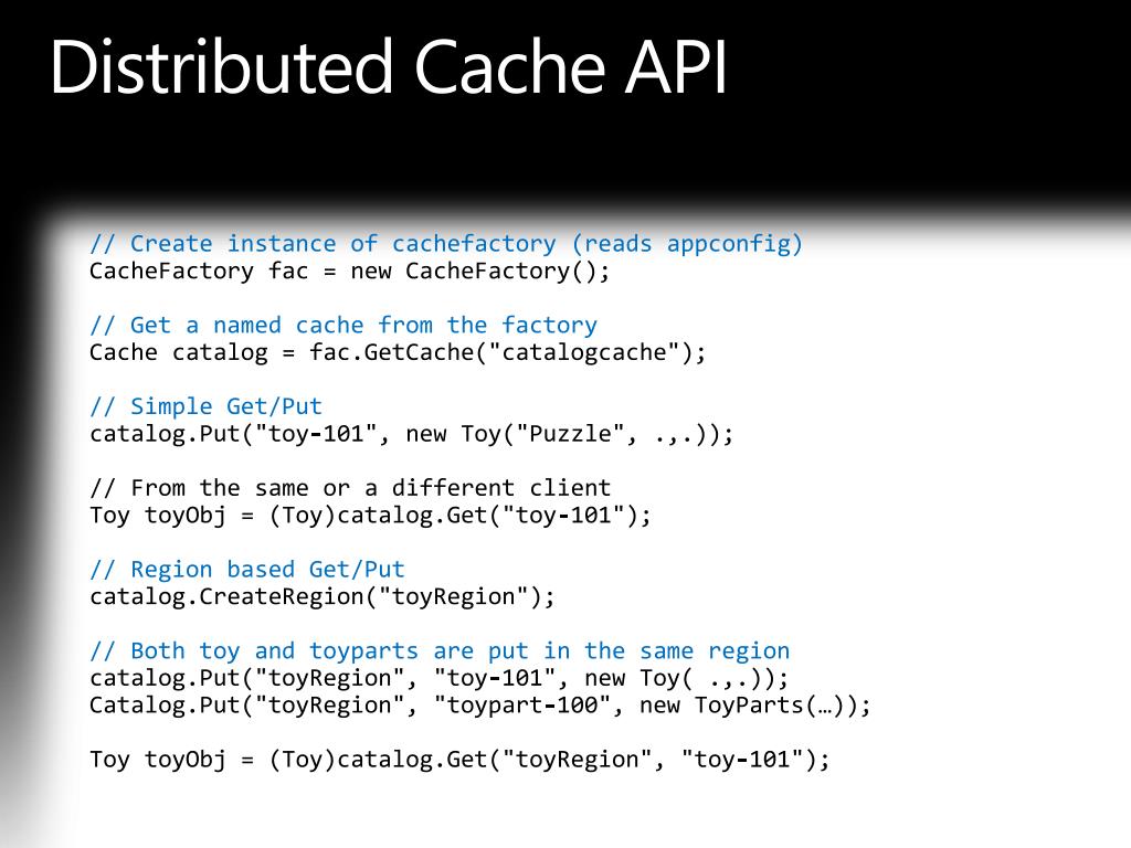 Distributed Cache API • // Create instance of cachefactory (reads appconfig) • CacheFactoryfac = new CacheFactory(); • // Get a named cache from the factory • Cache catalog = fac.GetCache("catalogcache"); • // Simple Get/Put • catalog.Put("toy-101", new Toy("Puzzle", .,.)); • // From the same or a different client • Toy toyObj = (Toy)catalog.Get("toy-101"); • // Region based Get/Put • catalog.CreateRegion("toyRegion"); • // Both toy and toyparts are put in the same region • catalog.Put("toyRegion", "toy-101", new Toy( .,.)); • Catalog.Put("toyRegion", "toypart-100", new ToyParts(…)); • Toy toyObj = (Toy)catalog.Get("toyRegion", "toy-101");