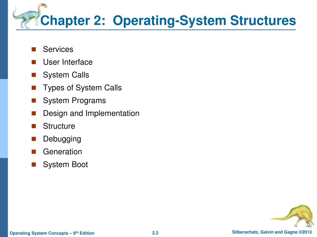 Chapter 2: Operating-System Structures • Services • User Interface • System Calls • Types of System Calls • System Programs • Design and Implementation • Structure • Debugging • Generation • System Boot