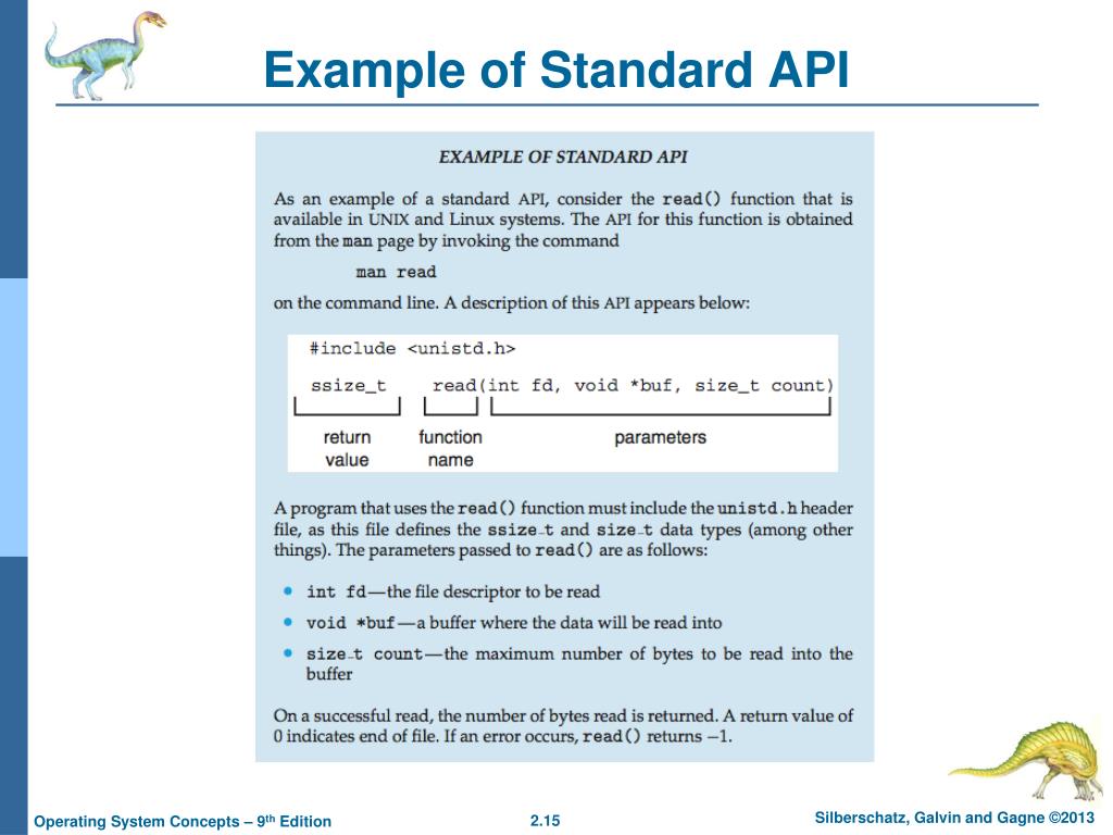 2. System Calls • Programming interface • to the services provided by the OS • Written in C or C++ • Mostly accessed via API • Win32 API • POSIX (Portable OS Interface) API • Java API • Why use APIs rather than system calls? • Portability • Easy of use