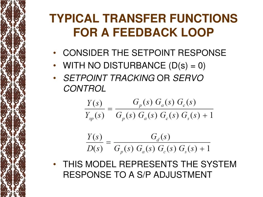 TYPICAL TRANSFER FUNCTIONS FOR A FEEDBACK LOOP • CONSIDER THE SETPOINT RESPONSE • WITH NO DISTURBANCE (D(s) = 0) • SETPOINT TRACKING OR SERVO CONTROL • THIS MODEL REPRESENTS THE SYSTEM RESPONSE TO A S/P ADJUSTMENT