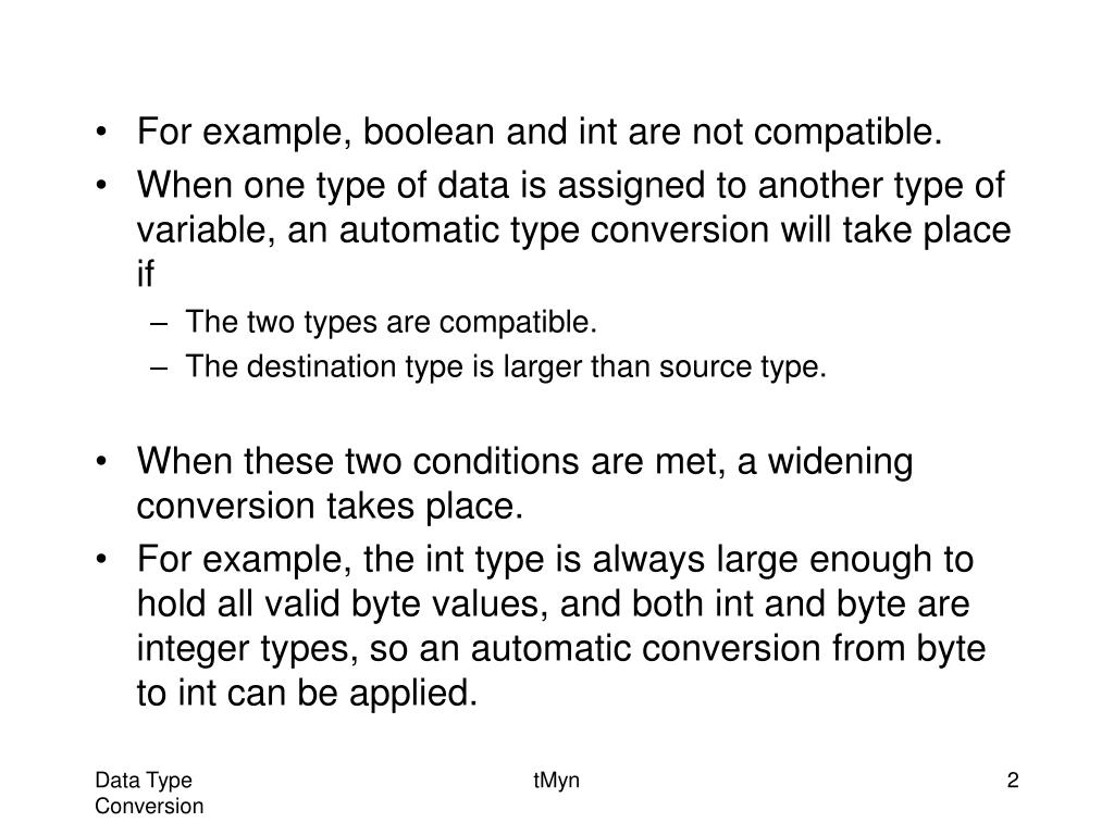 For widening conversions, the numeric types, including integer and floating-point types, are compatible with each other. • There are no automatic conversions from the numeric types to char or boolean. Also, char and boolean are not compatible with each other. • However, an integer literal can be assigned to char. tMyn
