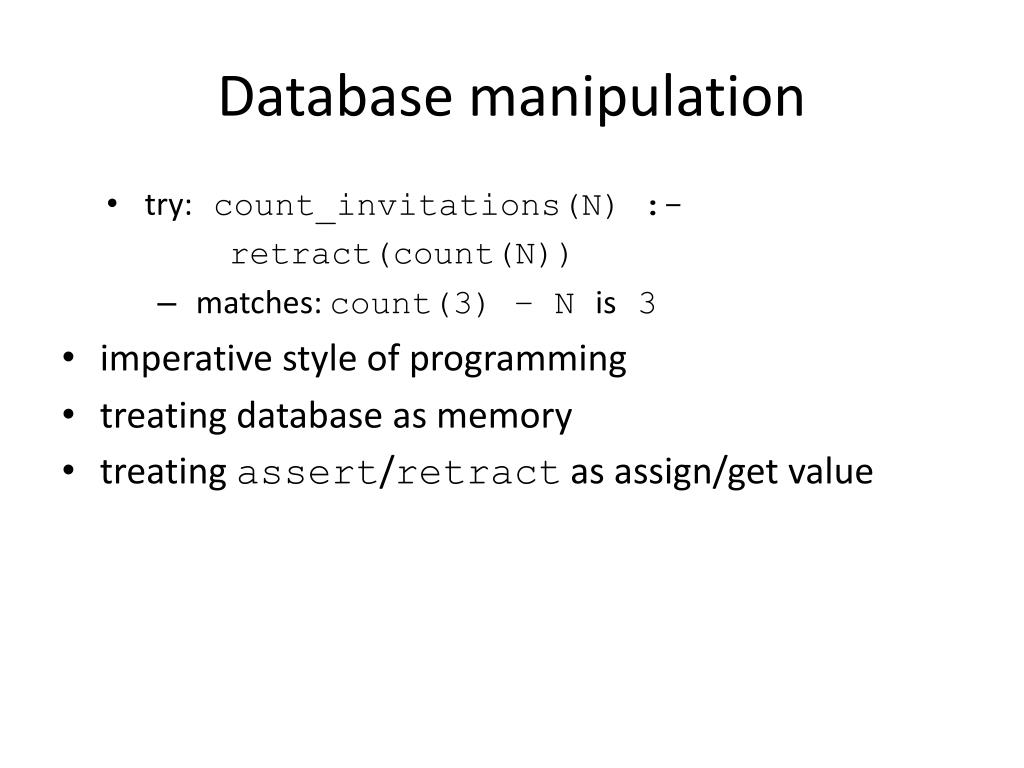 Database manipulation • try:count_invitations(N) :- retract(count(N)) • matches: count(3) – N is 3 • imperative style of programming • treating database as memory • treating assert/retract as assign/get value