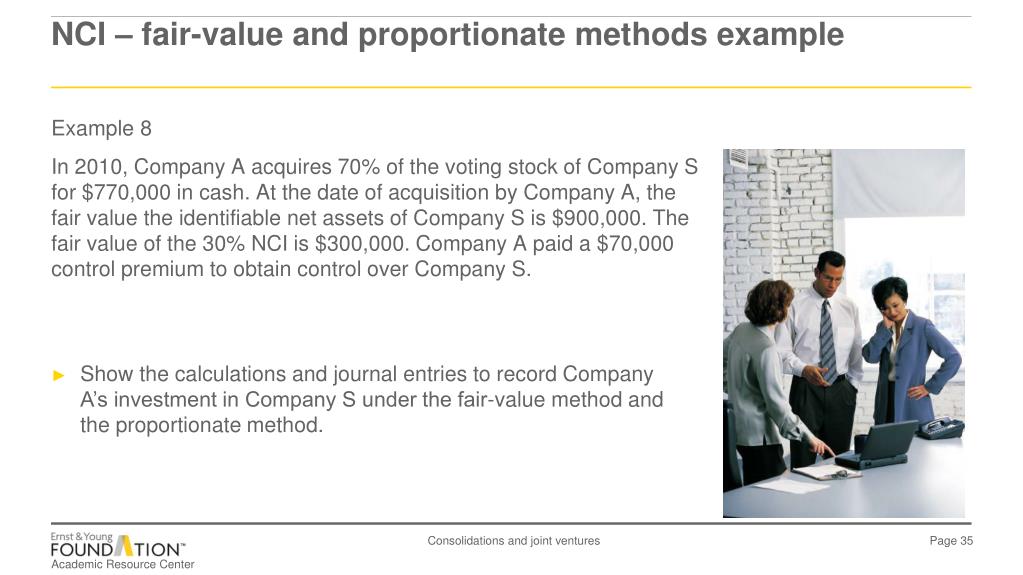 Example 8 solution (continued): Fair-value method: Cash $770,000 Fair value of the NCI 300,000 Fair value of the identifiable net assets of Company S (900,000) Goodwill $170,000 Journal entry: Fair value of identifiable net assets $900,000 Goodwill 170,000 Cash $770,000 NCI 300,000 NCI – fair-value and proportionate methods example
