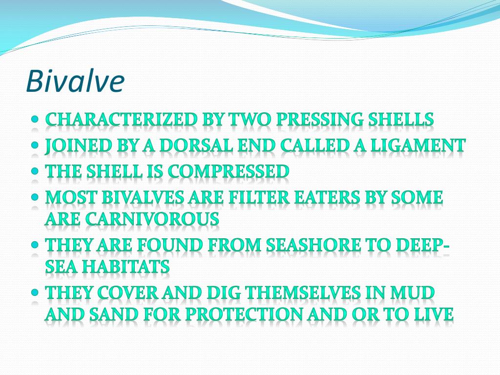 Bivalve • Characterized by two pressing shells • Joined by a dorsal end called a ligament • The shell is compressed • Most bivalves are filter eaters by some are carnivorous • They are found from seashore to deep-sea habitats • They cover and dig themselves in mud and sand for protection and or to live