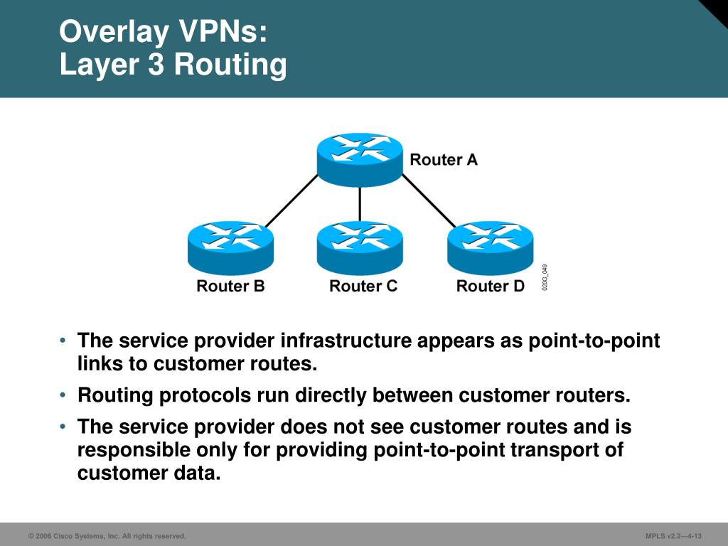 The service provider infrastructure appears as point-to-point links to customer routes. Routing protocols run directly between customer routers. The service provider does not see customer routes and is responsible only for providing point-to-point transport of customer data. Overlay VPNs:Layer 3 Routing