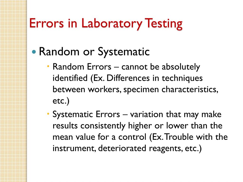 Errors in Laboratory Testing Random or Systematic Random Errors – cannot be absolutely identified (Ex. Differences in techniques between workers, specimen characteristics, etc.) Systematic Errors – variation that may make results consistently higher or lower than the mean value for a control (Ex. Trouble with the instrument, deteriorated reagents, etc.)