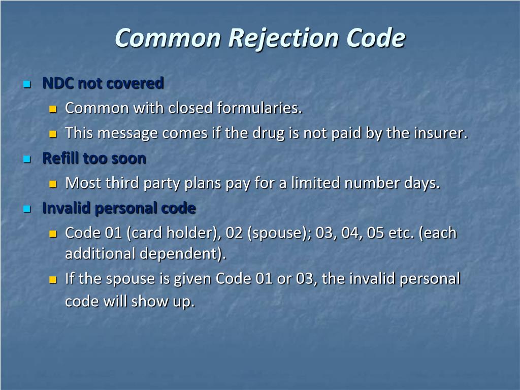 Common Rejection Code NDC not covered Common with closed formularies. This message comes if the drug is not paid by the insurer. Refill too soon Most third party plans pay for a limited number days. Invalid personal code Code 01 (card holder), 02 (spouse); 03, 04, 05 etc. (each additional dependent). If the spouse is given Code 01 or 03, the invalid personal code will show up.