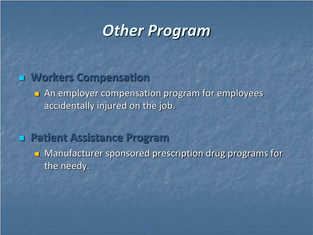 Other Program • Workers Compensation • An employer compensation program for employees accidentally injured on the job. • Patient Assistance Program • Manufacturer sponsored prescription drug programs for the needy.