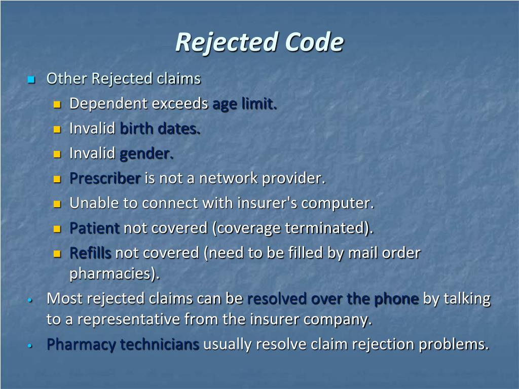 Rejected Code Other Rejected claims Dependent exceeds age limit. Invalid birth dates. Invalid gender. Prescriber is not a network provider. Unable to connect with insurer's computer. Patient not covered (coverage terminated). Refills not covered (need to be filled by mail order pharmacies). Most rejected claims can be resolved over the phone by talking to a representative from the insurer company. Pharmacy technicians usually resolve claim rejection problems.