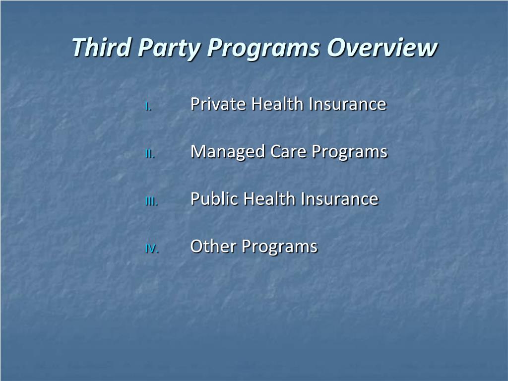 Third Party Programs Overview Private Health Insurance Managed Care Programs Public Health Insurance Other Programs