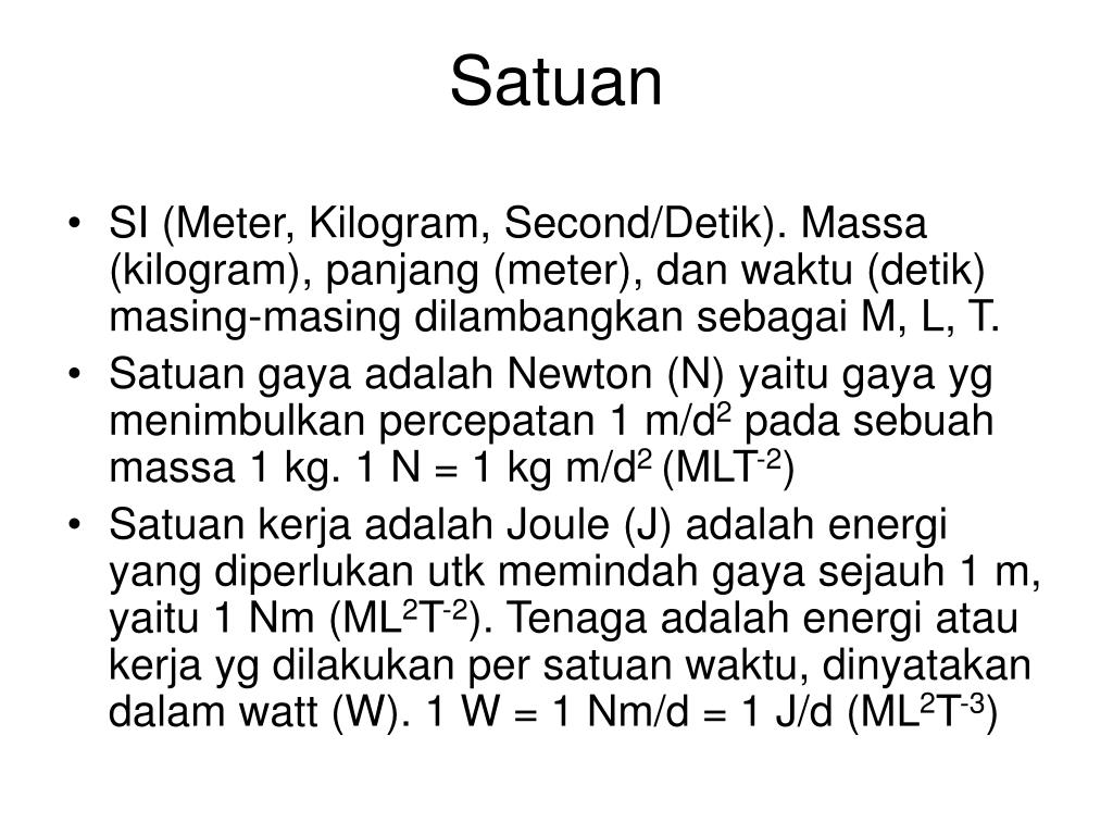 Satuan • SI (Meter, Kilogram, Second/Detik). Massa (kilogram), panjang (meter), dan waktu (detik) masing-masing dilambangkan sebagai M, L, T. • Satuan gaya adalah Newton (N) yaitu gaya yg menimbulkan percepatan 1 m/d2 pada sebuah massa 1 kg. 1 N = 1 kg m/d2 (MLT-2) • Satuan kerja adalah Joule (J) adalah energi yang diperlukan utk memindah gaya sejauh 1 m, yaitu 1 Nm (ML2T-2). Tenaga adalah energi atau kerja yg dilakukan per satuan waktu, dinyatakan dalam watt (W). 1 W = 1 Nm/d = 1 J/d (ML2T-3)