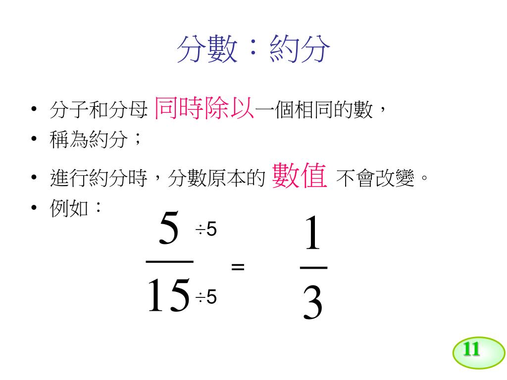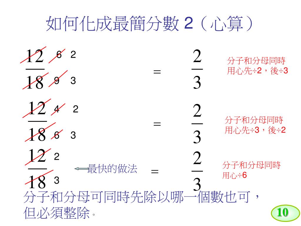 10 如何化成最簡分數 2(心算) 6 2 分子和分母同時用心先÷2,後÷3 9 3 4 2 分子和分母同時用心先÷3,後÷2 6 3 2 分子和分母同時用心÷6 最快的做法 3 分子和分母可同時先除以哪一個數也可,但必須整除。