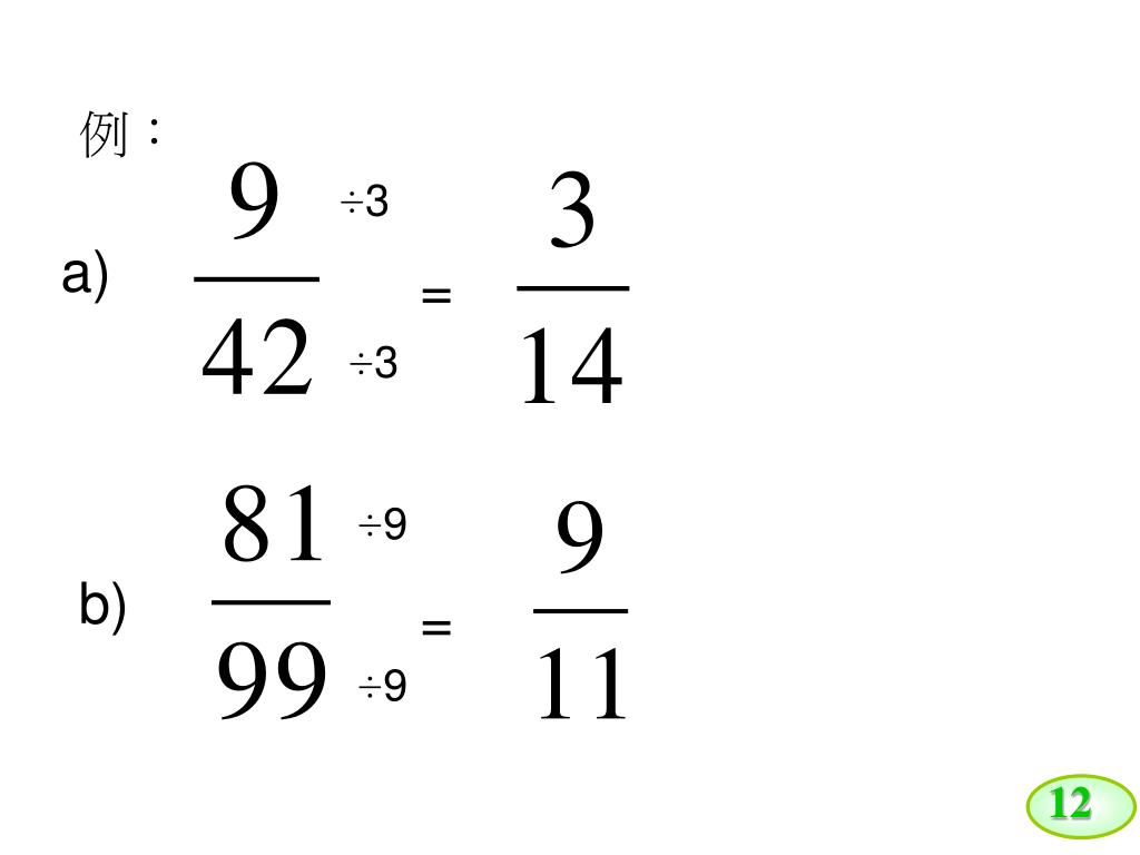11 分數:約分 • 分子和分母 同時除以一個相同的數, • 稱為約分; • 進行約分時,分數原本的 數值 不會改變。 • 例如: ÷5 = ÷5