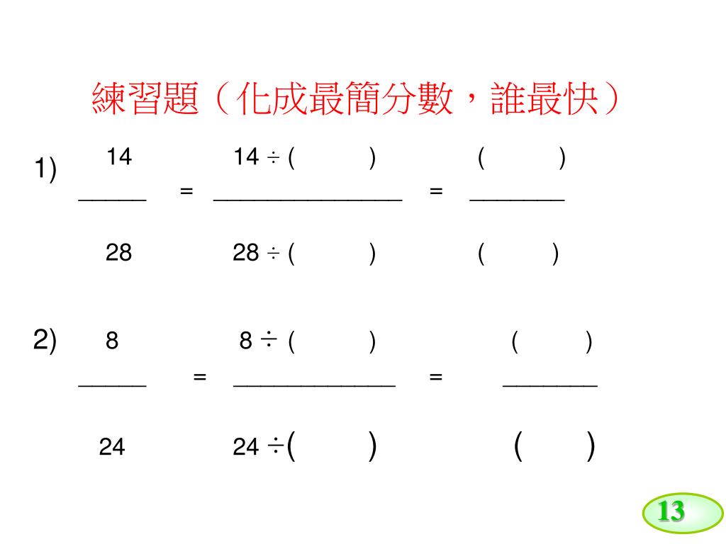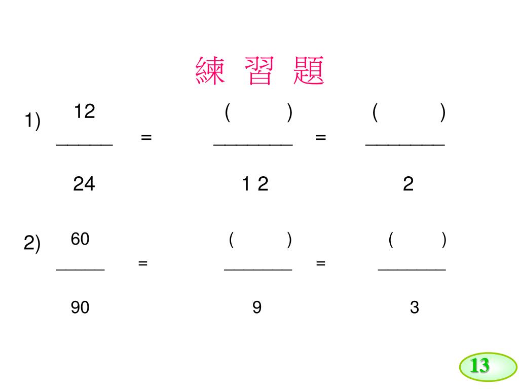 13 練 習 題 1) 12 ( ) ( ) _____ = _______ = _______ 24 1 2 2 2) 60 ( ) ( ) _____ = _______ = _______ 90 9 3