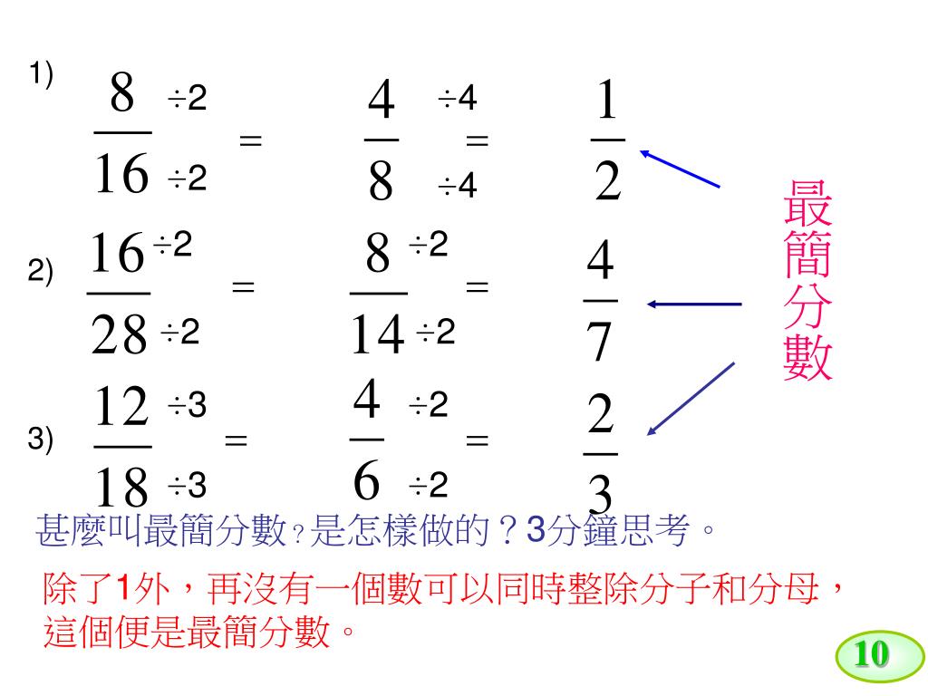 10 1) ÷2 ÷4 ÷2 ÷4 最簡分數 ÷2 ÷2 2) ÷2 ÷2 ÷3 ÷2 3) ÷3 ÷2 甚麼叫最簡分數?是怎樣做的?3分鐘思考。 除了1外,再沒有一個數可以同時整除分子和分母,這個便是最簡分數。