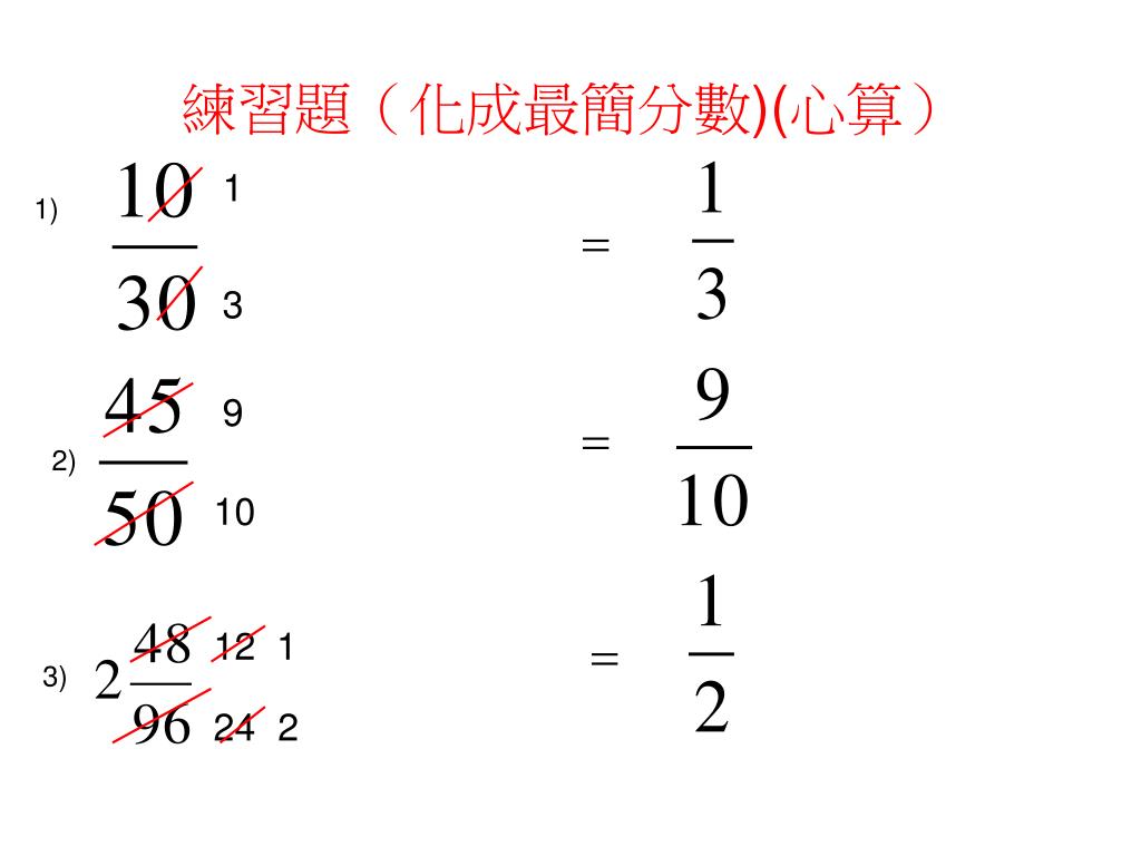 練習題(化成最簡分數)(心算) 1 1) 3 9 2) 10 12 1 3) 24 2