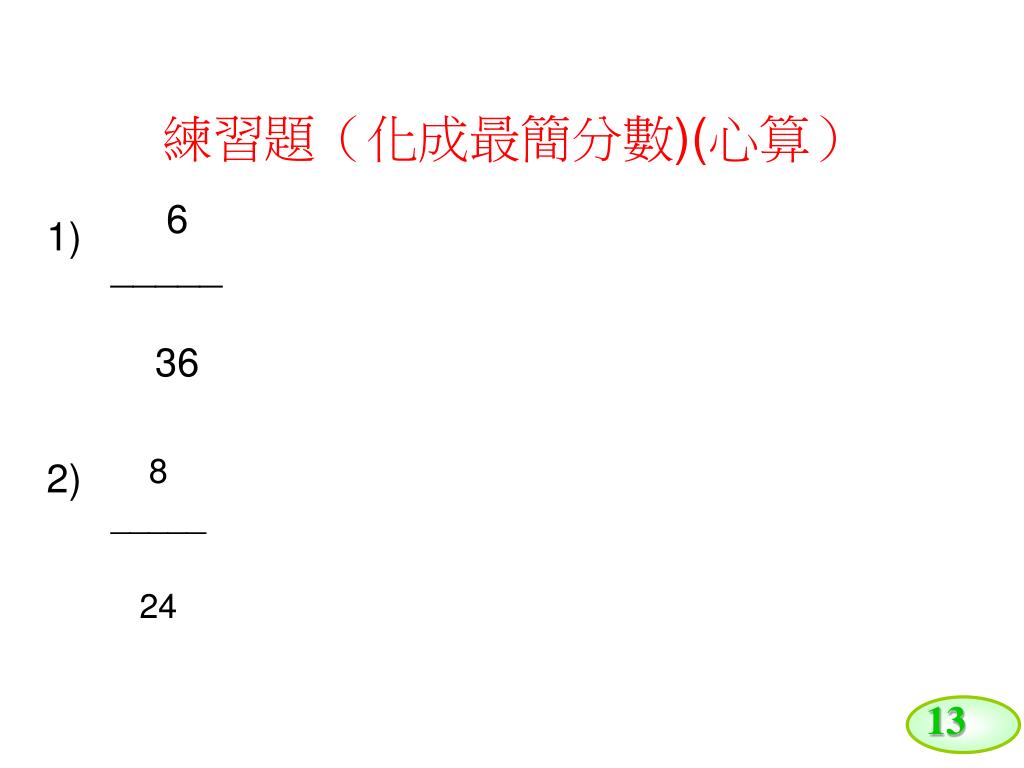 13 練習題(化成最簡分數)(心算) 1) 6 _____ 36 2) 8 _____ 24