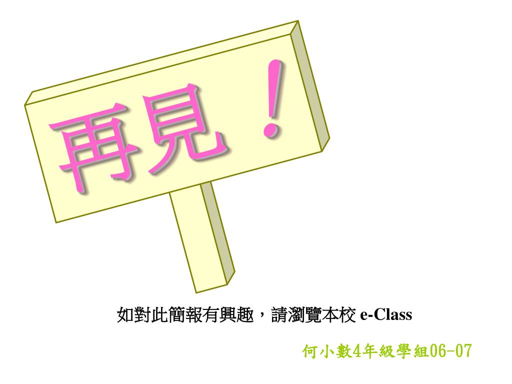 再見! 如對此簡報有興趣,請瀏覽本校 e-Class 何小數4年級學組06-07